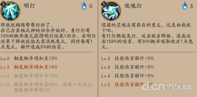 [明灯]强化:己方其他式神的回合开始时,青行灯有10%的概率使之获得明灯效果1回合,在明灯效果下释放技能无需消耗鬼火。觉醒强化:在队友触发[明灯]效果时, 每有1点鬼火,额外造成5%的伤害。