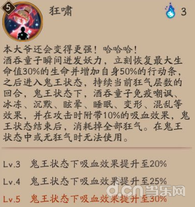 酒吞童子瞬间迸发妖力,立刻恢复最大生命值30%的生命并增加自身50%的行动条,之后进入鬼王状态,持续当前狂气层数的回合,鬼王状态下,酒吞童子免疫嘲讽、冰冻、沉默、眩晕、睡眠、变形、混乱等效果,并在攻击时附带10%的吸血效果,鬼王状态结束后,消耗掉全部狂气。在鬼王状态中或无狂气时无法使用。