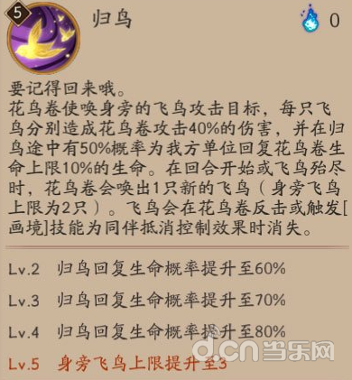 调整技能升级时的效果,满级技能飞鸟存储上限由4只下调为3只,但每只飞鸟攻击的伤害由30%上调为40%,触发归鸟恢复生命的概率由60%上调为80%。
