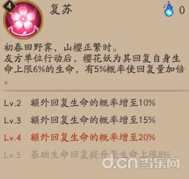 ※[复生]调整为:友方单位行动后,樱花妖为其回复自身生命上限6%的生命,有5%概率使回复量加倍。