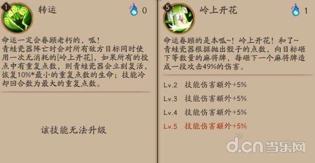 [转运]调整为:青蛙瓷器阵亡时会对所有敌方目标同时使用一次无消耗的[岭上开花],如果所有的骰子点数中出现重复,则青蛙瓷器会立刻复活,恢复10%*最小的重复点数的生命;技能冷却回合数为最大的重复点数。