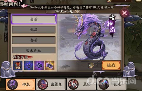 挑战成功,除了掉皮肤兑换材料、金币之外,还能获得一个高级御魂(4~6星,掉落御魂种类,与当日御魂副本一致)。
