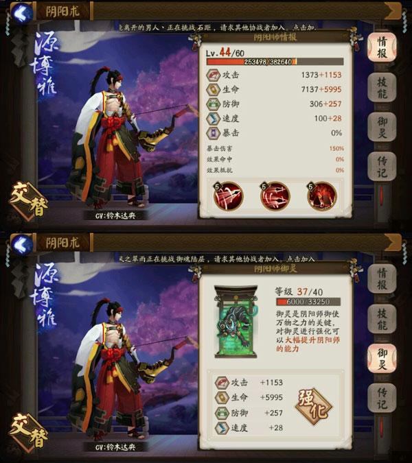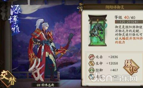 1、阴阳师的三维属性可以通过升级御灵来提升。以源博雅为例,当等级升满后,阴阳师的战力能得到极大的提升,其中速度值也能达到128。