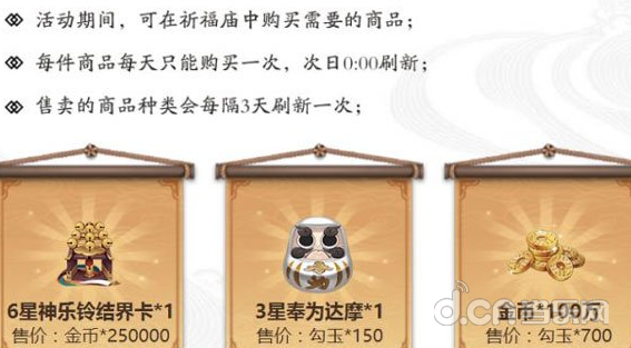 ※活动期间,可在祈福庙中购买需要的商品,每件商品每天只能购买一次,次日0:00刷新,售卖的商品种类会每隔3天刷新一次。认准高性价比。。