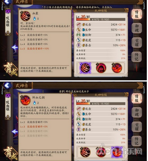提到反击流,另一个不可少的式神就是吸血姬。吸血姬的普攻伤害血越少越厉害,如上所述,御魂首推狰。血袭技能堆满伤害为145%,本身S攻击加上御魂效果和暴击,血量低的式神经常一口咬死。御魂除了狰以外,另外两个位置加暴击或攻击都可以,当然为了保险也可以对一下效果抵抗,因为之所以反击就是因为自己不是先手,有时候遇到控制流的对手很烦,所以堆一下效果抵抗可以让吸血姬不被控制反而咬死对方。