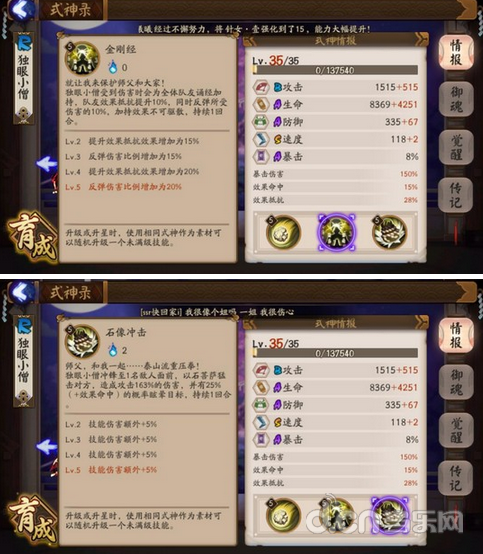 第三个反击流式神是个R式神独眼小僧。这个式神主要技能金刚经就是为反击而生的。受到伤害时为全体队友诵经加持,反弹20%伤害,增加20%效果抵抗。大家不要小看这个技能,带上独眼小僧,阵容中再带一个镜子,遇到双拉条对手时,有时我都不用出手就弹死对方了。