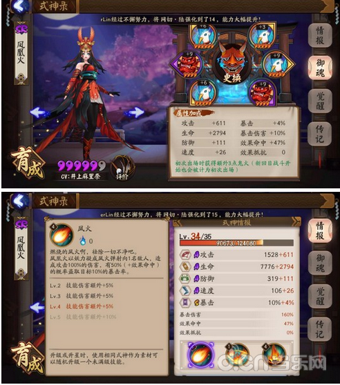 有时候我会用以下的凤凰火替换独眼小僧就成了曾流行一时的雨火流。技能虽然没满级,但她主要不是用于攻击。凤凰火不用多说,偷暴击率,眩晕效果50%且不可驱散,暴击时有可能再行动一次补攻一下没有眩晕的小伙伴。御魂我带的火灵既能充当打火机又增加效果命中。这里补充一下,凤凰火的速度一定要在雨女后面,而且不要差太远,避免被对方控制式神插队。