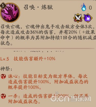 召唤·炼狱:在③和⑤里,诛心针对单体造成大额伤害,并添加减益。一杀造成200%伤害,让神乐化身成为狗粮王啊~这两个神祭只能针对不同的情况选择一个。