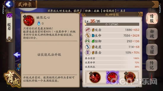 二技能:嫉恨之心,般若的核心,核心,核心技能。没有这个被动,般若可能也只能充当花瓶了。上次更新之后对这个被动添加了可以受效果命中影响的说明(虽然之前有玩家测试过般若是吃效果命中的),所以这次般若算是稍稍加强了。觉醒之前,只能封印御魂效果,觉醒之后可以封印御魂效果和被动技能。