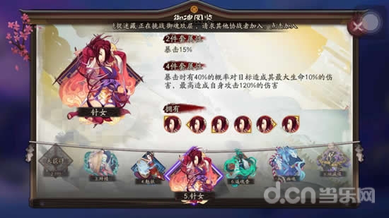 理由:针女所触发的最大生命10%的伤害是可以触发般若被动的,狂暴状态下两段攻击与针女的效果也十分契合,增加输出的同时又加强封印概率。建议二号位带速度,四号位效果命中,六号位暴击,副属性优先选择效果命中,其次速度。这样能够保证先手以及稳定性。