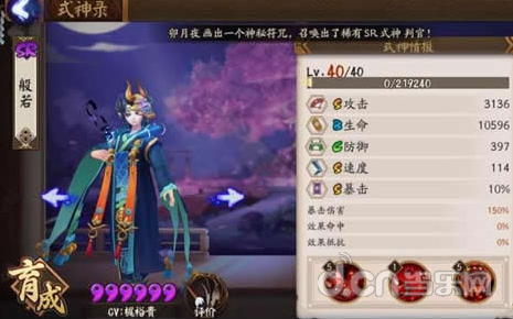如图可以看到般若面板属性完全不输输出型的ssr式神,3136的攻击和大天狗、两面佛是一样的,还要高于姑获鸟一些。114的速度还是比较快的。