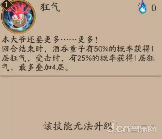 △被动技能是酒吞童子狂气的来源,也是其他技能运作的核心。需要注意的是,椒图涓流传递的伤害并不能触发被动用来堆叠狂气,在有护盾的情况下也不能通过受击获得狂气。同时,此技能产生的狂气可被雨女、樱花妖、青坊主等式神驱散。除此之外,狰和轮入道的伪回合也能进行是否产生狂气的判定。