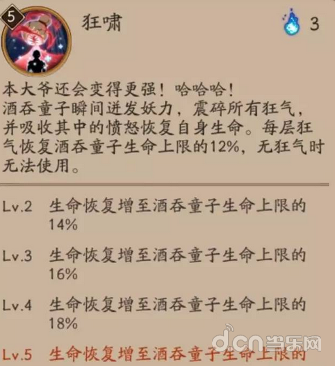 △较为中庸的大招。因为只能奶自己,代价却为清空全部狂气显得过于高昂。没有狂气的酒吞童子和有狂气的酒吞童子很明显是两个截然不同的式神。所以在大多数情况下,不会选择使用这个技能。当然,在一些特殊阵容(比如酒吞童子核心的无奶队)和特殊情况(比如酒吞童子被镜姬反伤处于残血状态)下,此技能依然存有意义,不能一概而论。