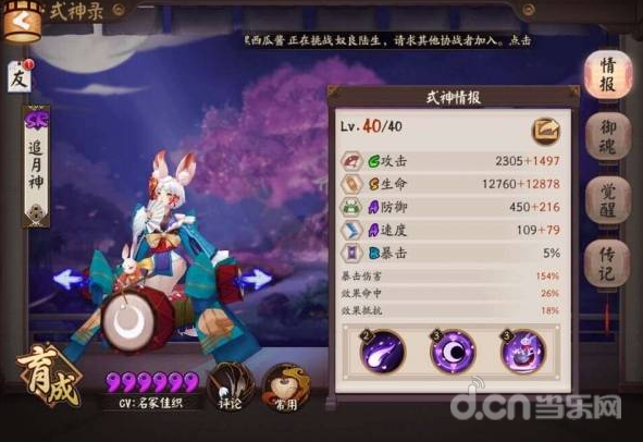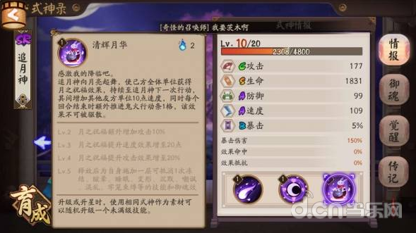 追月神的整体面板如图CSAAB,S级别的生命12760略低于辉夜姬的13785,A级防御450不输于辉夜姬。属于完全合格的辅助式神。而A级的速度109则中规中矩。