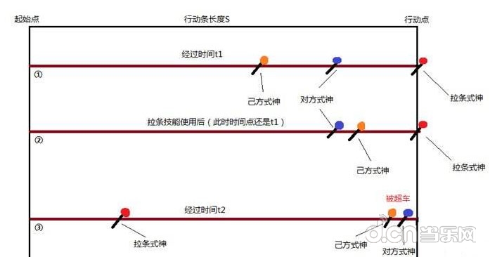 我方拉条式神到达终点时候,使用技能【拉条】,二速式神瞬间发生位移,但是并没有到达终点,再经过一段时间之后,对面一速式神竟然超过我方二速率先抵达终点,开始行动。整个超车过程一定是这样,那我简单画个示意图让大家更好地理解。