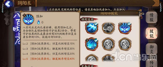 解析:这是一个推图神技,基本上给大天狗、姑获鸟、小黑这类的式神,上个预知,哪怕只剩下血皮,一个技能就能回满,续航能力极强。