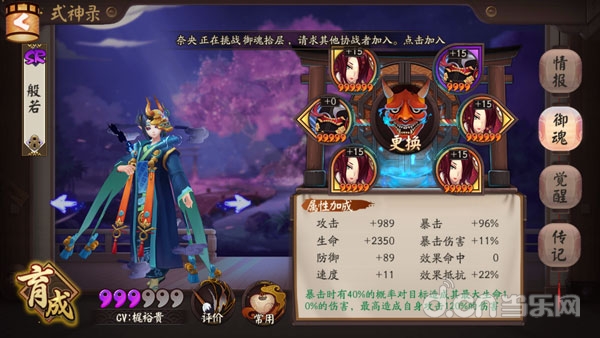 所以,般若还是安心带媚妖/魍魉吧,(堆命中散件也是最常见的御魂搭配)针女般若6暴击太脆了,副属性还需要权衡速度,命中,暴击三种属性,实在有些得不偿失。况且,2速4命中6暴击的伤害,你用过六星桃花吗?