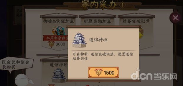 ※会长或副会长可以消耗寮勋章购买“道馆神垣”创建道馆,在神社→寮内采办消耗1500勋章获得。