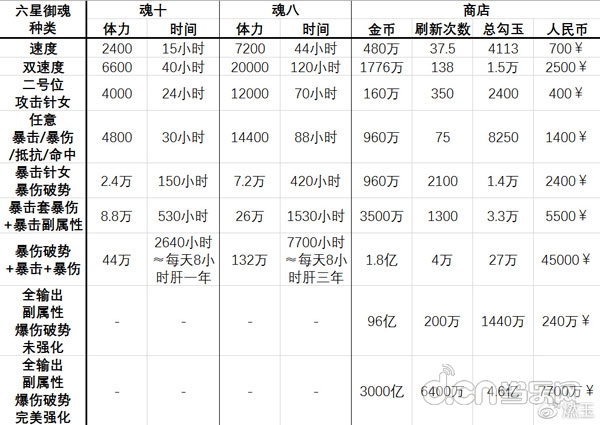 (不同类型的极品御魂,通过魂十(含业原火)、商店获得的成本)