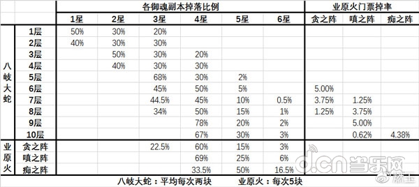 1. 八岐大蛇:平均每次2块御魂;业原火:每次5块御魂