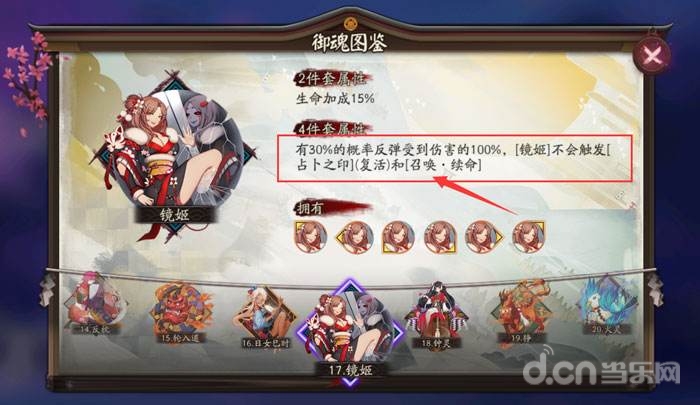 四件套:有30%概率反弹受到伤害的100%,镜姬不会触发(占卜之印·复活)和(召唤·续命)