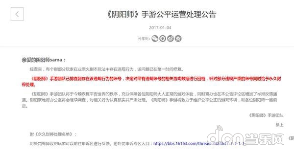 昨晚,网易游戏官网发布公告称:“经查实,有个别部分玩家在业原火副本玩法中存在违规行为,该问题已在第一时间修复。《阴阳师》手游团队已排查到存在该违规行为的账号,决定对所有违规账号的相关游戏数据进行回档,针对部分违规严重的账号同时给予永久封停处理 。”此外,还公布了永久封停处理的名单。