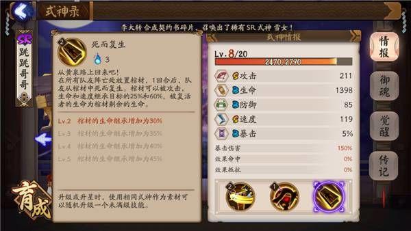 复活式神:2号位选择速度或血量,4件套推荐防御类御魂,如地藏像,被服,镜姬或者辅助类御魂如三味,招财猫等。
