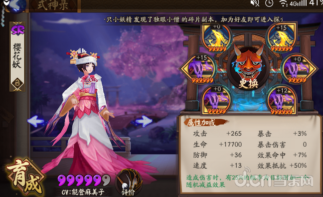 副属性方面还是建议生命抵抗,虽说樱花不要求速度但速度还是越快越好,条件允许的情况下也还是要堆些暴击,偶尔来点小惊喜也不错。