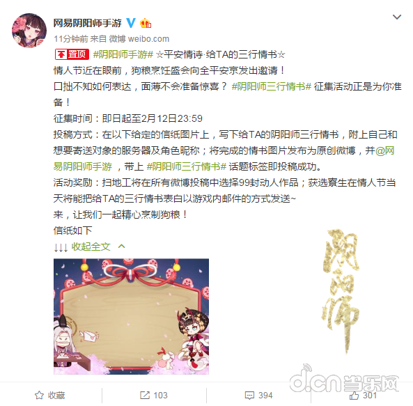 盼望着、盼望着春天来了,情人节的脚步近了,在这个单身狗苦恼的日子里,《阴阳师》也将大晒恩爱,推出《阴阳师》情人节三行情书征集活动。口拙不知如何表达,面薄不会准备惊喜?三行情书征集活动正是为你准备!今年情人节是《阴阳师》小伙伴为心中的TA抒发情感的绝佳机会,但对于单身玩家也是一顿不得不咽下的狗粮大餐。