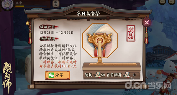 “冬日美食祭”有酒有汤有串,让人食指大动,玩家前往游戏内庭院-许愿架,点击“美食祭”灯笼即可参加活动。该H5上线后迅速引发了玩家们的分享热潮,玩家在H5中可以通过猜拳形式与美食店主进行比赛,赢了即可赢得10张料理券,每个玩家每日最多可通过H5获得480张料理券。此券可供玩家在游戏中抽取美食道具:在活动入口界面,使用活动期间获得的料理券,便有机会抽取到新推出的美食主题结界卡。美食主题结界卡为特定结界卡,可在加入阴阳寮后配置在结界中使用,除了使特定式神获取结界经验,还将掉落式神碎片等随机奖励。