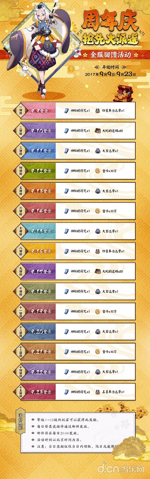 9月9日-9月23日期间,每晚20:00登陆《阴阳师》即可在邮件内领取。详情请看下图。