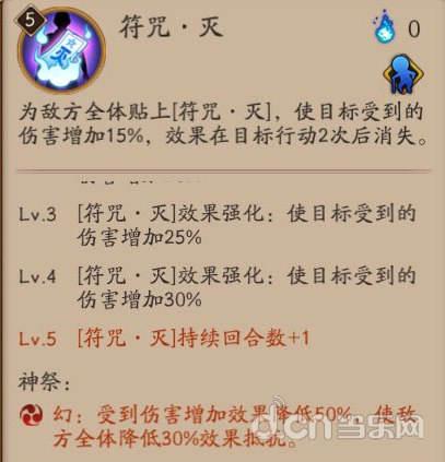 符咒·灭:只在⑥里,只有一种神祭技能“幻”,效果降低50%意味着目标受到的伤害只能增加15%,而降低对方的效果抵抗可以配合控制阵容。