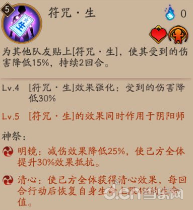 符咒·生:组合①和③,明镜适合后手队,清心适用于pve(花鸟卷的缩小版~),当然也可以配合后手,两个都可以带着提高肉队的生存~