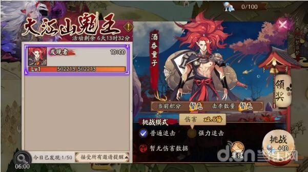 8月8日维护后-8月14日23:59期间,等级达到15级的阴阳师可以通过探索、御魂、觉醒等副本,及鬼王“搜寻”功能来发现鬼王酒吞童子。大家可选择单人挑战,或集结好友、寮友一起挑战。战斗结束后,将根据对鬼王造成的伤害,及鬼王的难度和星级获取积分和战功。