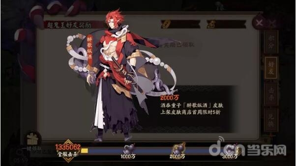 当全服总击杀次数达到2000万时,即可解锁酒吞童子皮肤·醉歌纵酒限时优惠——上架皮肤商店首周5折!