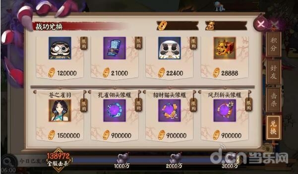 各位阴阳师可使用击杀鬼王获得的战功,在战功商店兑换超值奖励,更有八百比丘尼皮肤·苍之雀羽、白狼皮肤·箭羽凌风、鬼之怒头像框、孔雀翎头像框、招财猫头像框、风烈斩头像框等稀有奖励!