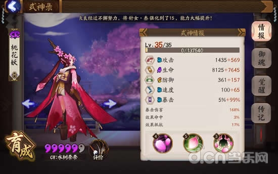 这里用的是自己养的五星桃花妖,脸黑,少了一个2件套,所以属性稍逊色。但暴击还是达到了104%。