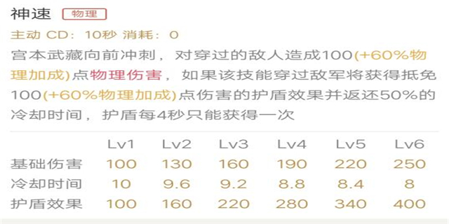 整体分析:这个技能是宫本唯一的位移技能,穿过敌方单位触发护盾可以让宫本在前期抗压中更好的保持状态,也让宫本在近身肉搏中占尽优势,返还50%CD让宫本中后期几乎无限释放二技能,让宫本有了粘着别人打的资本。