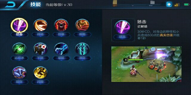 韩信目前只有打野路走最为适合,因此召唤师技能选择惩击,帮助快速清野。