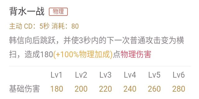整体分析:释放技能命中目标后,50%攻速加成能够帮助韩信快速清野,击杀敌方后排,第四次攻击带击飞效果为韩信补充了一重控制。