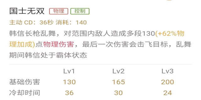 整体分析:释放大招期间处于霸体状态,可以用于规避很多控制技能,并且大招最后一次伤害,附带击飞效果,为韩信补充控制。