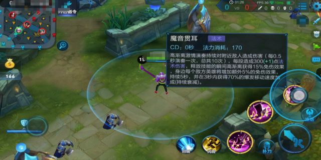 技能解析:这个技能是高渐离唯一一个控制技能,此技能是AOE伤害,在施放过程中和一技能一样可以移动,但是技能伤害有效范围很窄,必须要近身施放,所以建议最好配合大招一起施放。