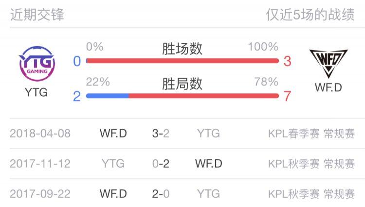 KPL春季赛目前进行到第六个比赛周。本周第四个比赛日最后一场比赛是由YTG对阵WF.D,这是本赛季两队的第二次对战。双方在KPL历史共交手3次,WF.D均获得胜利。但是双方本赛季交手,WF.D以3-2的战绩艰难获胜。因此此次两队交手胜负难说。
