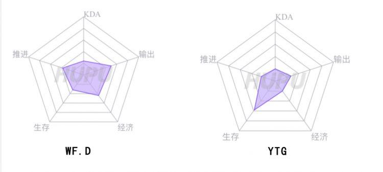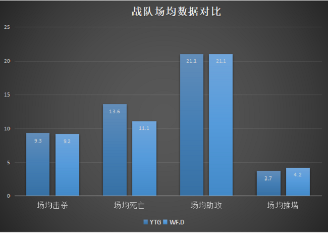 通过观察两队数据对比,可以发现在场均数据上两支战队的表现非常相似。唯一一个表现出队伍特征的就是场均死亡和场均推塔了。由于YTG在团战配合上做的较差,在获得近乎同样的击杀的时候死亡人数也较多,由此产生的分均承伤也较多。场均推塔方面则完全表现了WF.D的优势,会更注重兵线运营和推塔节奏。因此在本场比赛中,YTG能否做好自己的兵线运营和防御塔的把控是关键。