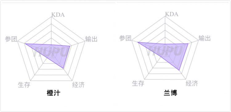橙汁和兰博同为中路位置,因为数据表现风格一致。但是细节上仍然存在很大的差别,由于队伍的团战分工不明确,橙汁的输出环境较为恶劣,由此形成的生存意识较好。兰博在使用一些缺少位移的英雄时,打法过于激进,走位偶尔会存在失误。
