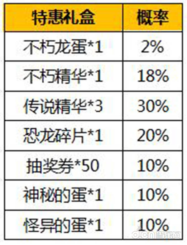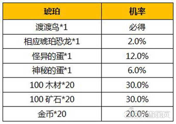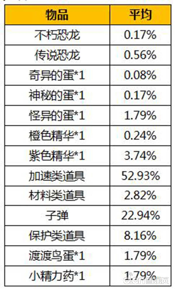 《我的恐龙》游戏内随机玩法中物品产出概率公布如下: