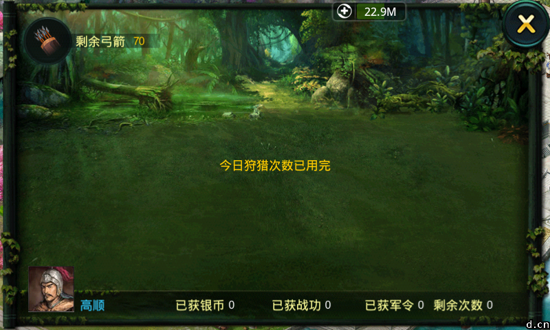 每天2次免费狩猎的机会。狩猎不仅可以获得金钱、战功、军令,还是能获得大量的经验。这里的提到的经验只有主将能获得,所以,当其他三个武将在训练的时候,用主将去狩猎,达到的效果就是四个武将同时成长。