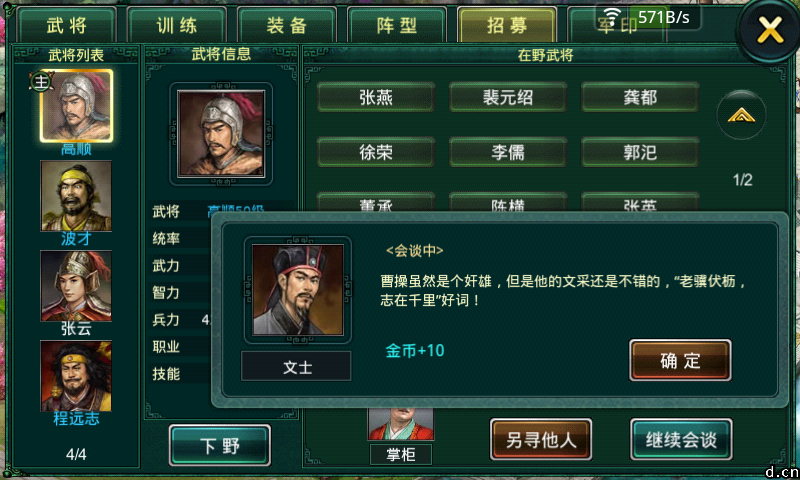 每天在酒馆有6次免费会谈的机会,在酒馆会随机碰到不同的人,碰到武将也是有可能,但是概率比较低,人品好也许就能碰上。但是除了武将,还能获得战功、银币、威望等,这些也是很不错的东西。