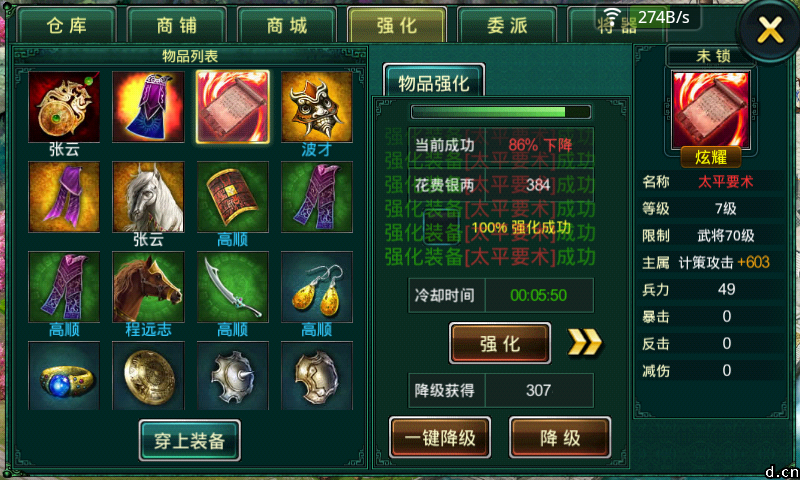 装备强化冷却时间为11分钟。前期一定要多强化装备,但是也不要什么装备都强化,还是要选取那些值得靠谱的强化。什么样的才算靠谱的?装备品质中绿色