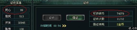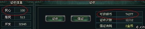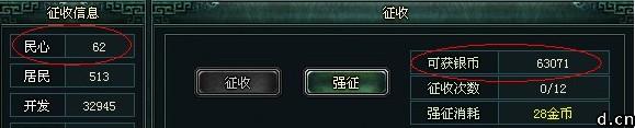 征收想征多少就征多少吗?哪有那么好的事,还是要问人民的意愿。因此,征收银两的多少是随着民心的数值相应变化的。从下图也可以看出